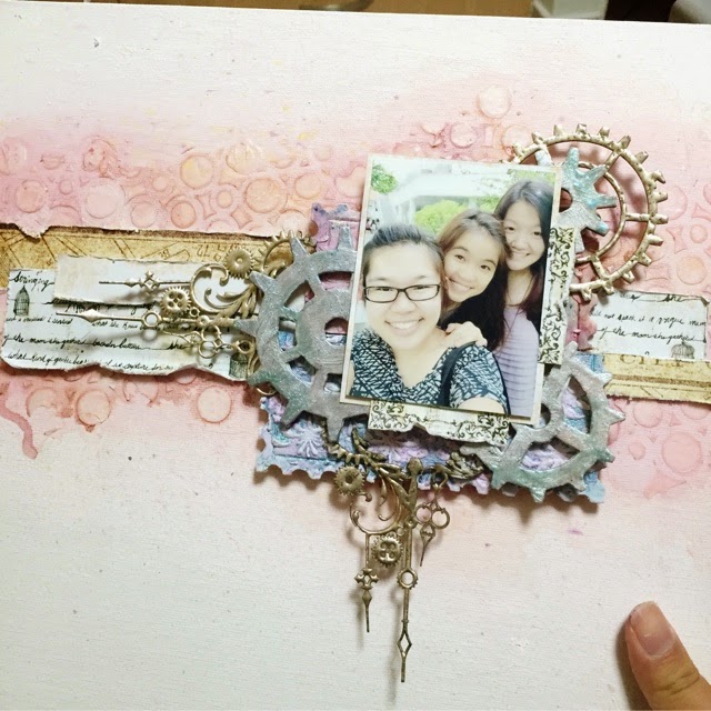 I also decided to cut the chipboard in half, so that they can extend from the picture. I also used my heavy gesso on the Prima Finnabair stencil on top of the blues that I misted. I layered everything following the vertical direction of the sketch. I chose this circles stencil cos it reminded me of snow which unfortunately, we don't get to experience it in Singapore, since it's forever summer here. Haha.